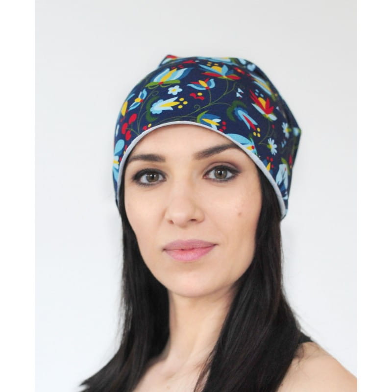 Modrá elegancia s kúskom tradície: Bavlnená čiapka s ľudovým motívom