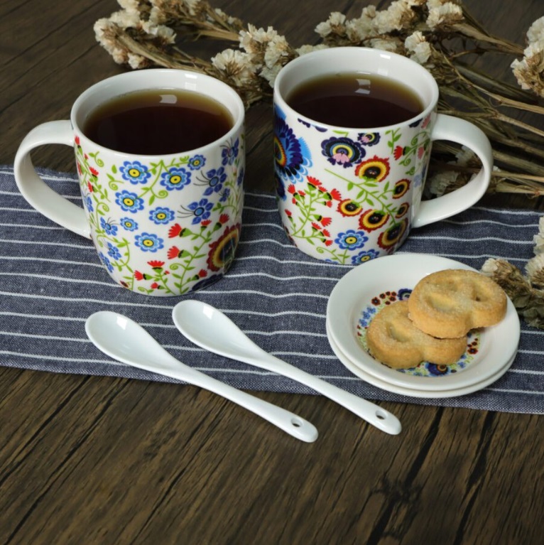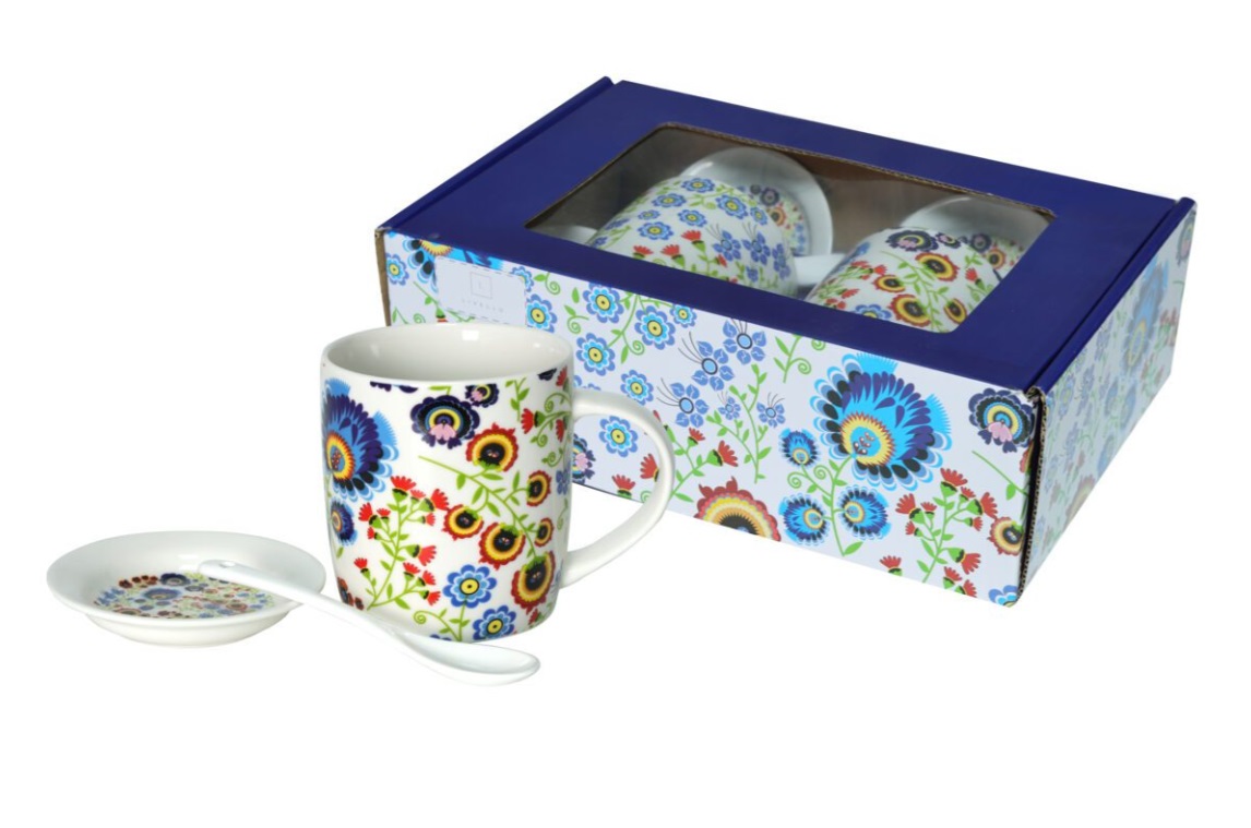 • Sada 2 hrnčekov, 2 tanierikov a 2 lyžičiek – kompletná sada pripravená na použitie