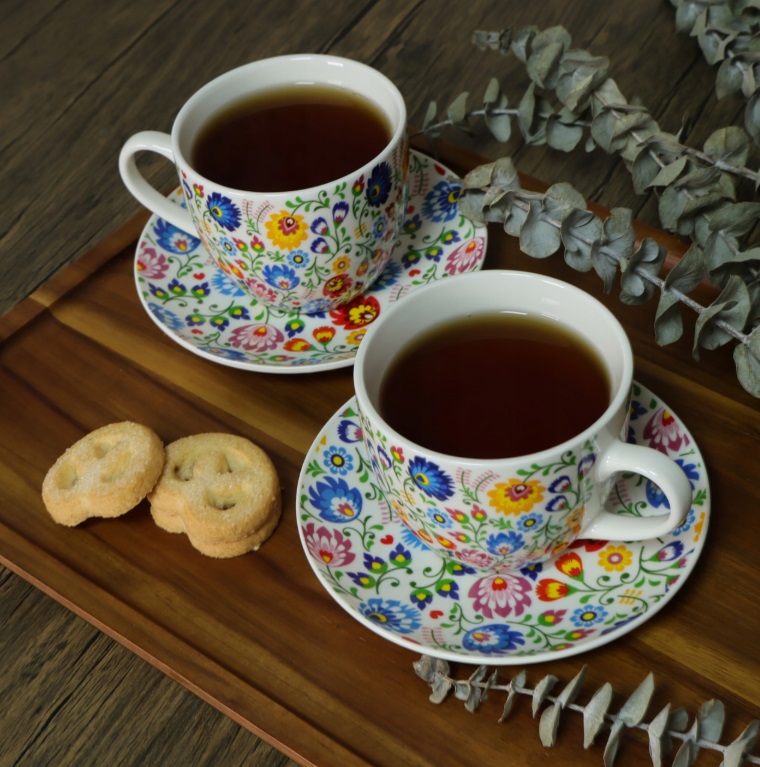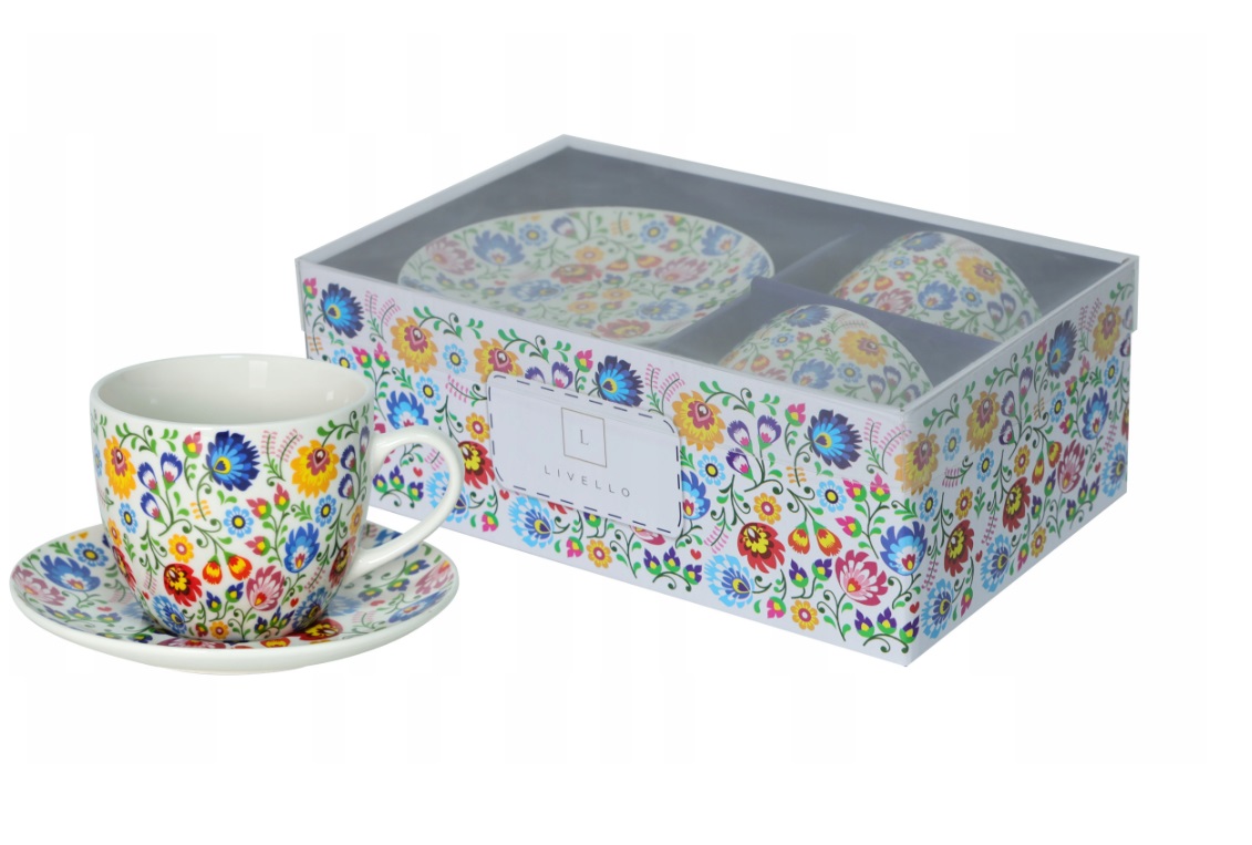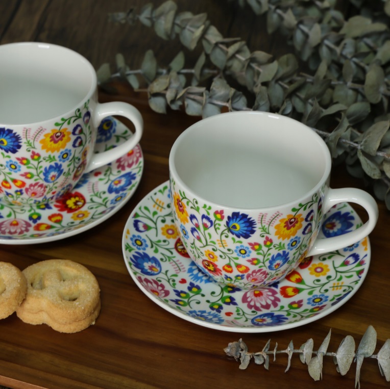 Šálky sú zdobené farebným kvetinovým ľudovým motívom, ktorý dodáva veselý, prírodný nádych každému interiéru. Pohodlná rukoväť a dokonale zladené podšálky robia z používania sady čistý pôžitok.