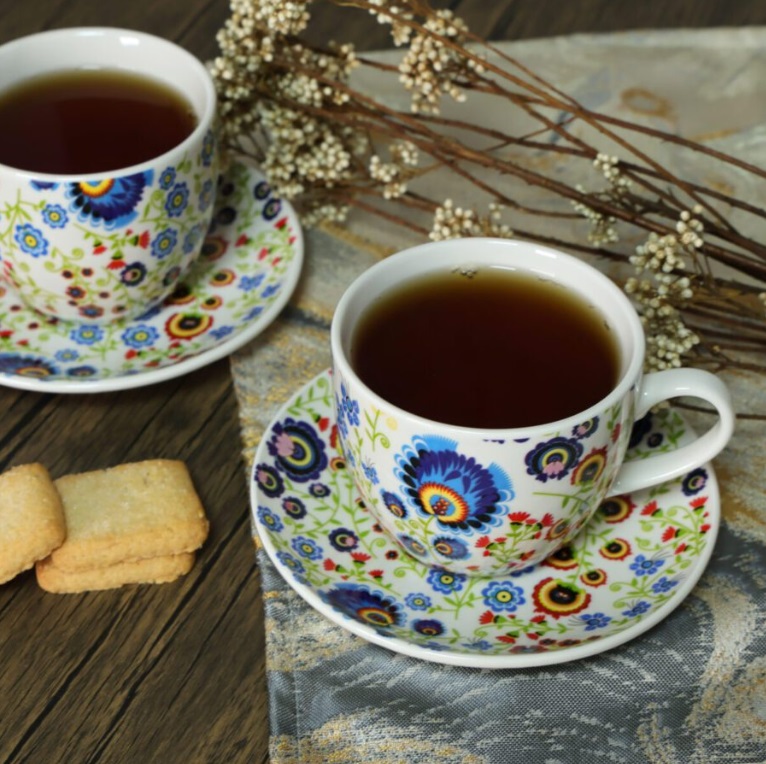 Šálky sú zdobené farebným kvetinovým ľudovým motívom, ktorý dodáva veselý, prírodný nádych každému interiéru. Pohodlná rukoväť a dokonale zladené podšálky robia z používania sady čistý pôžitok.