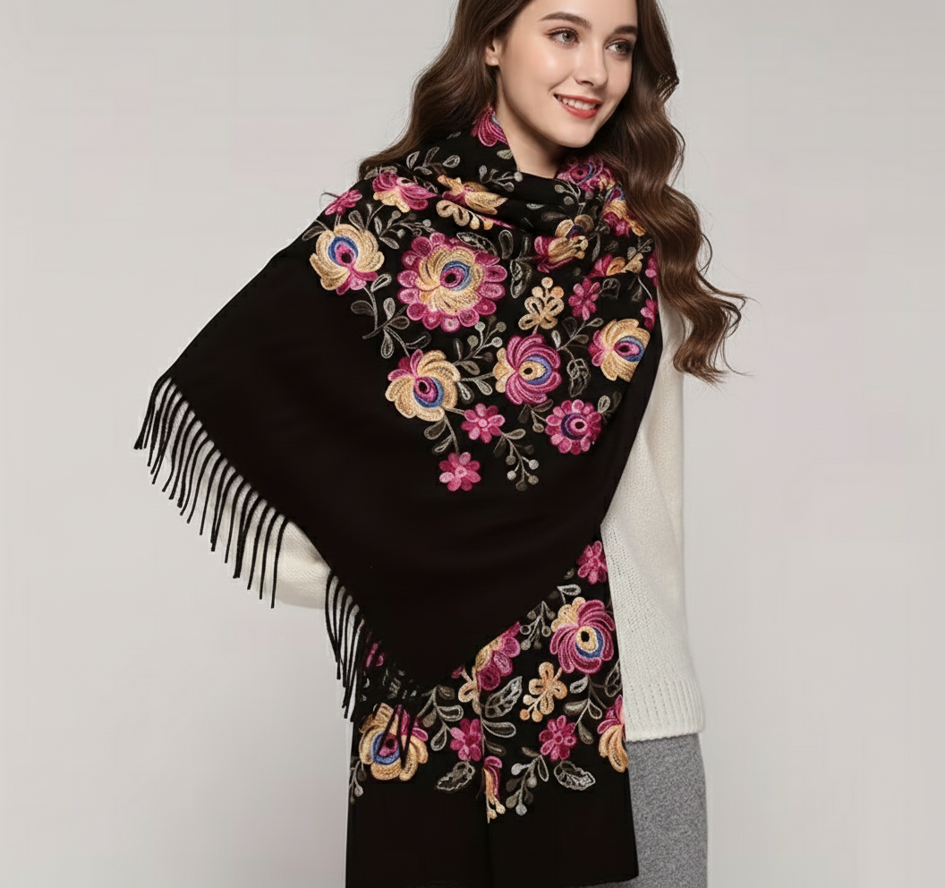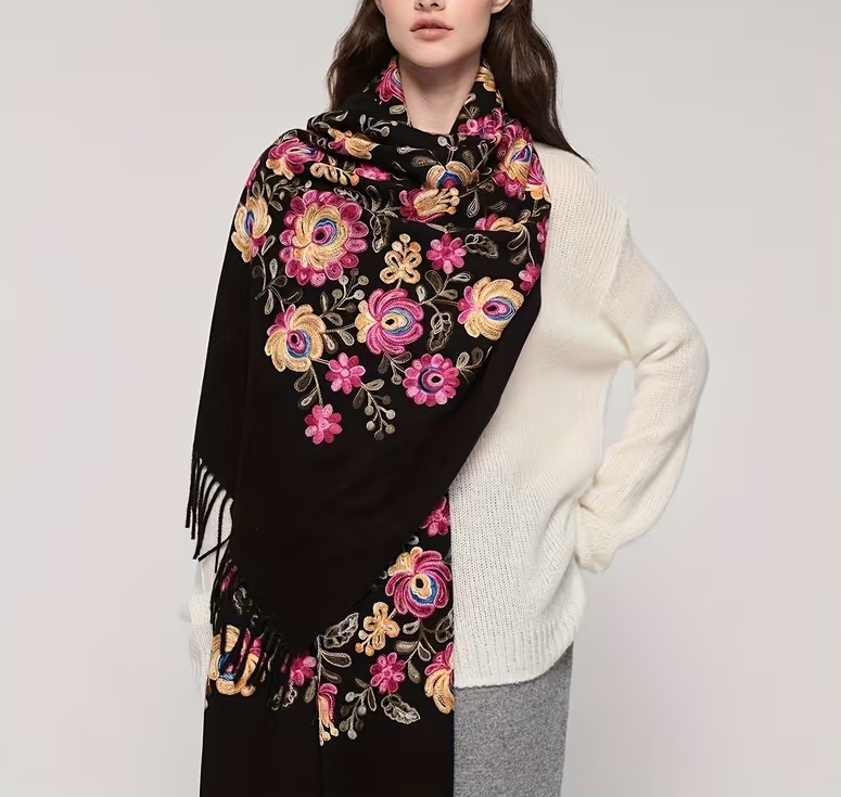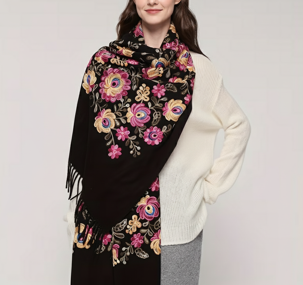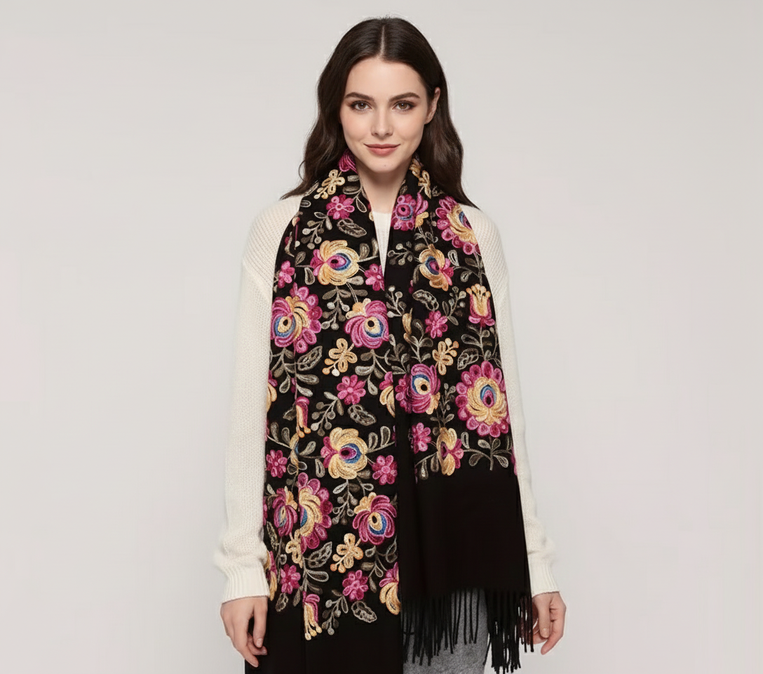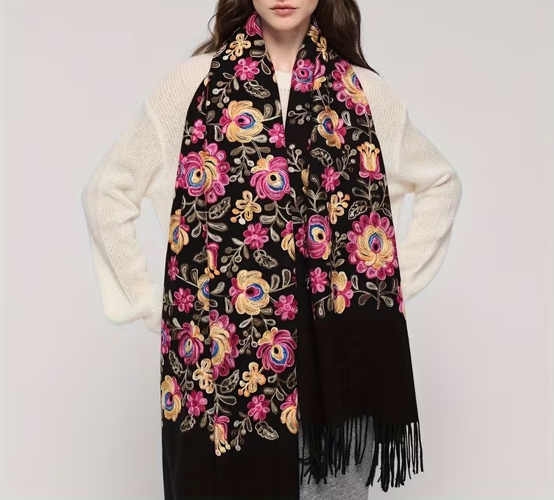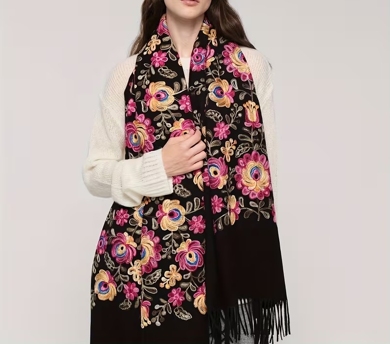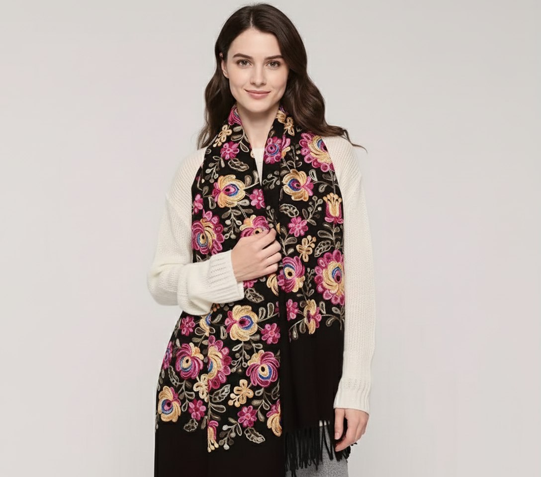 Krásny dlhý šál zdobený retiazkovou výšivkou ľudových ruží a strapcami.