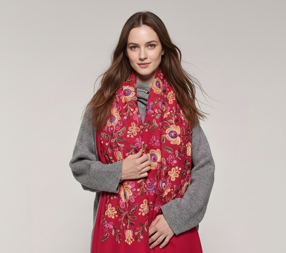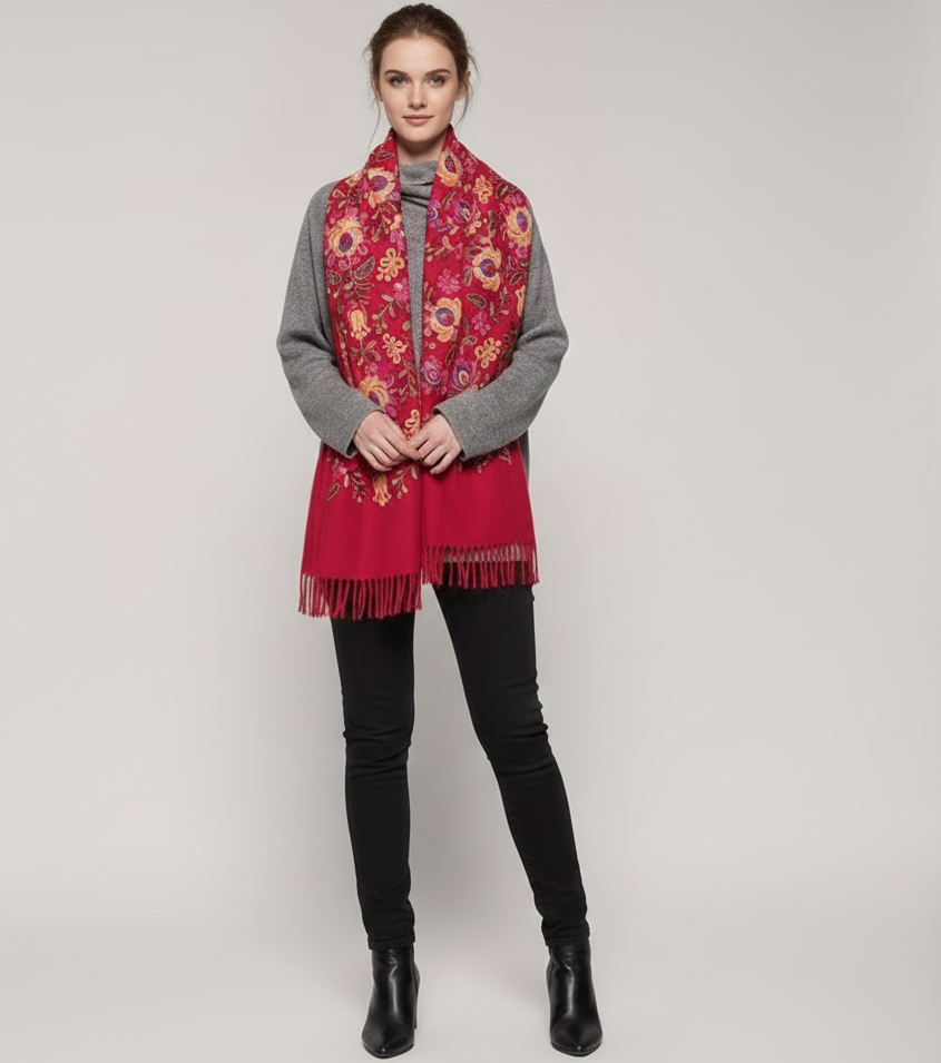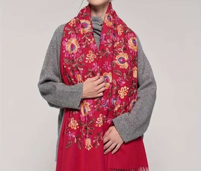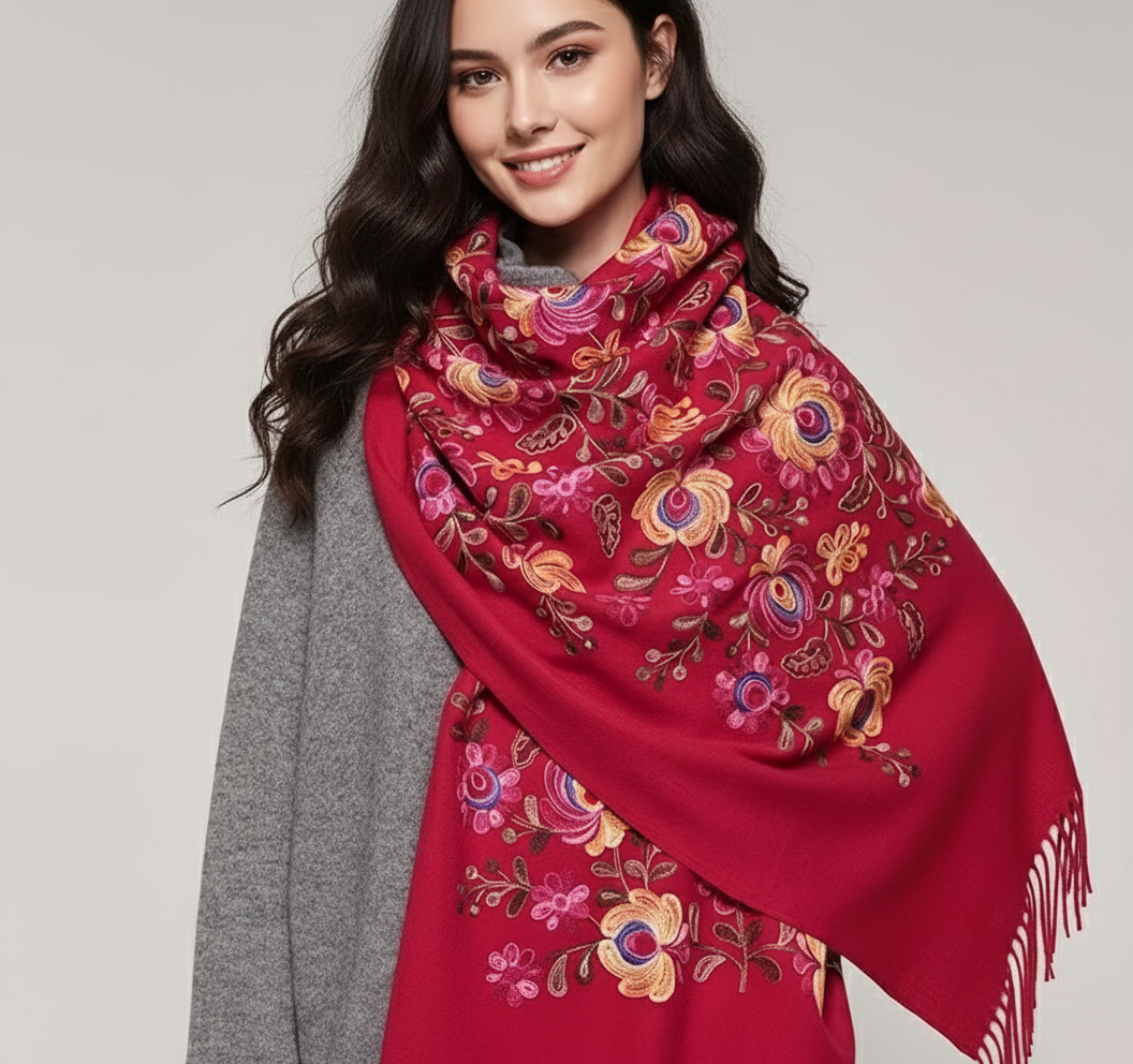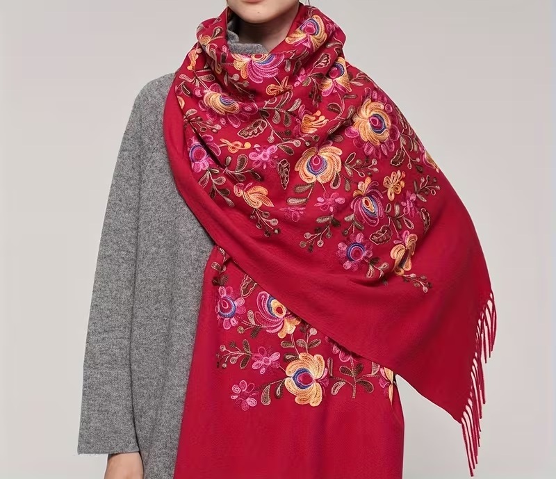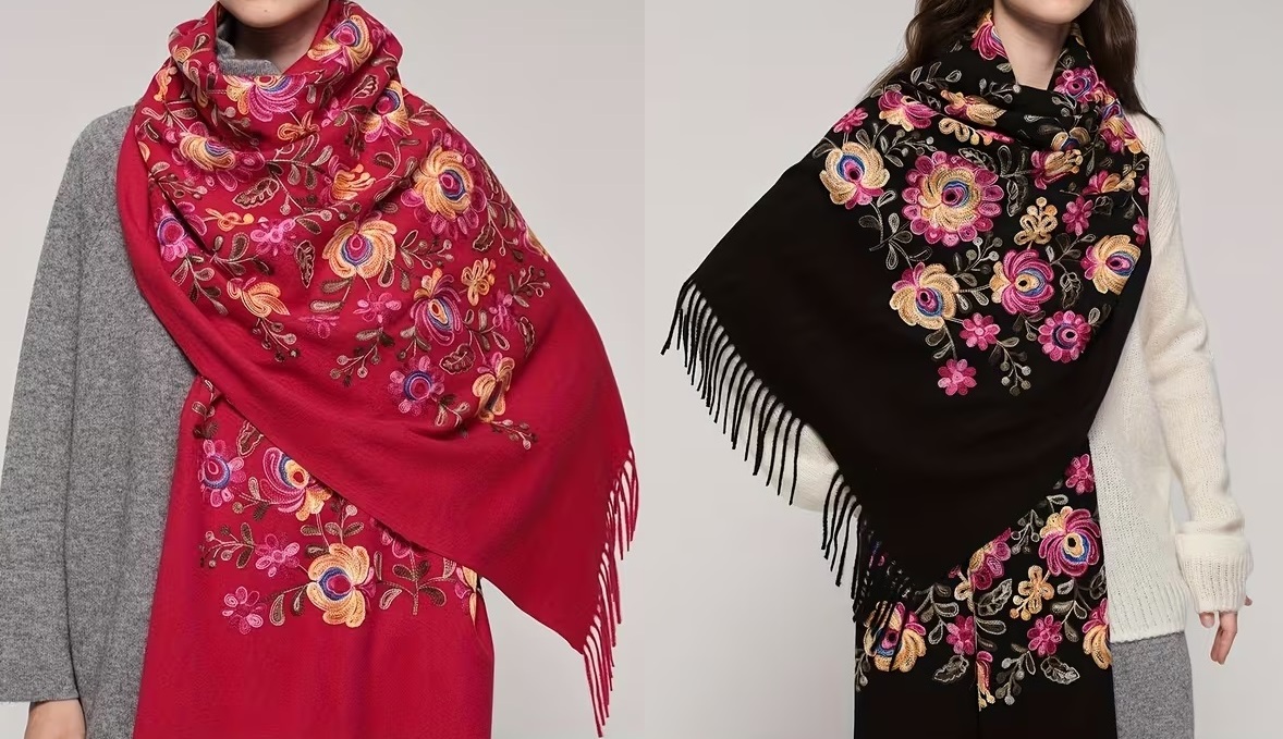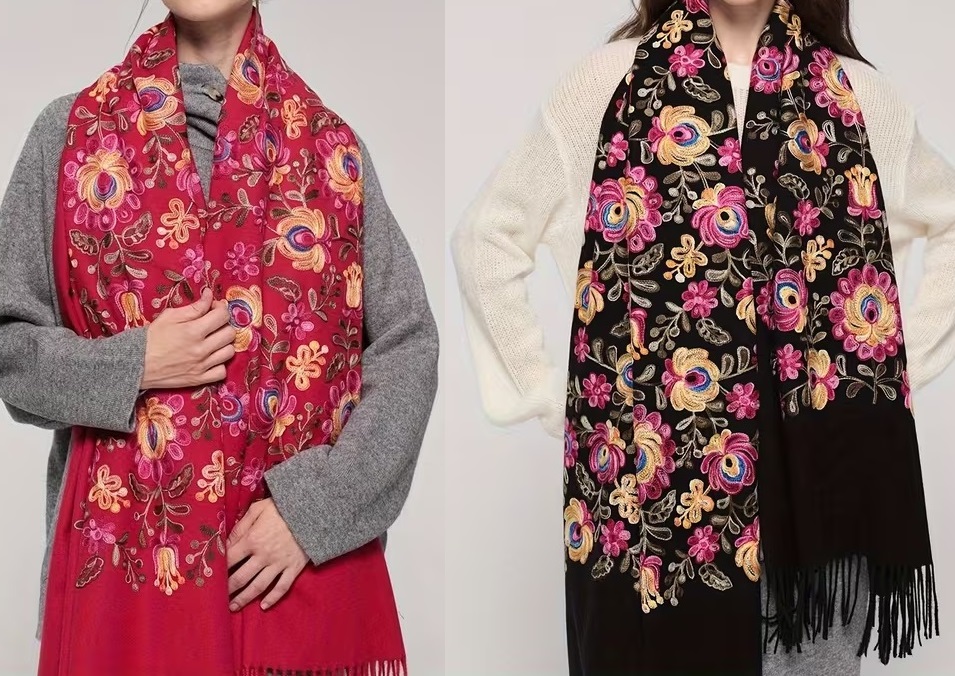 Krásny dlhý šál zdobený retiazkovou výšivkou ľudových ruží a strapcami.