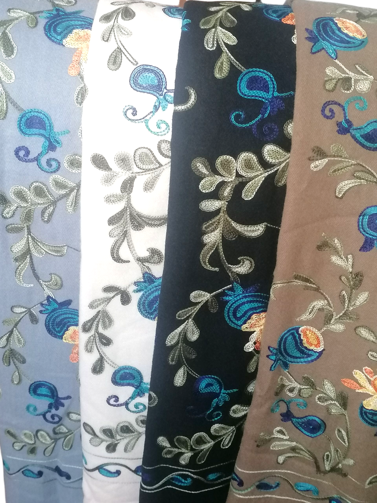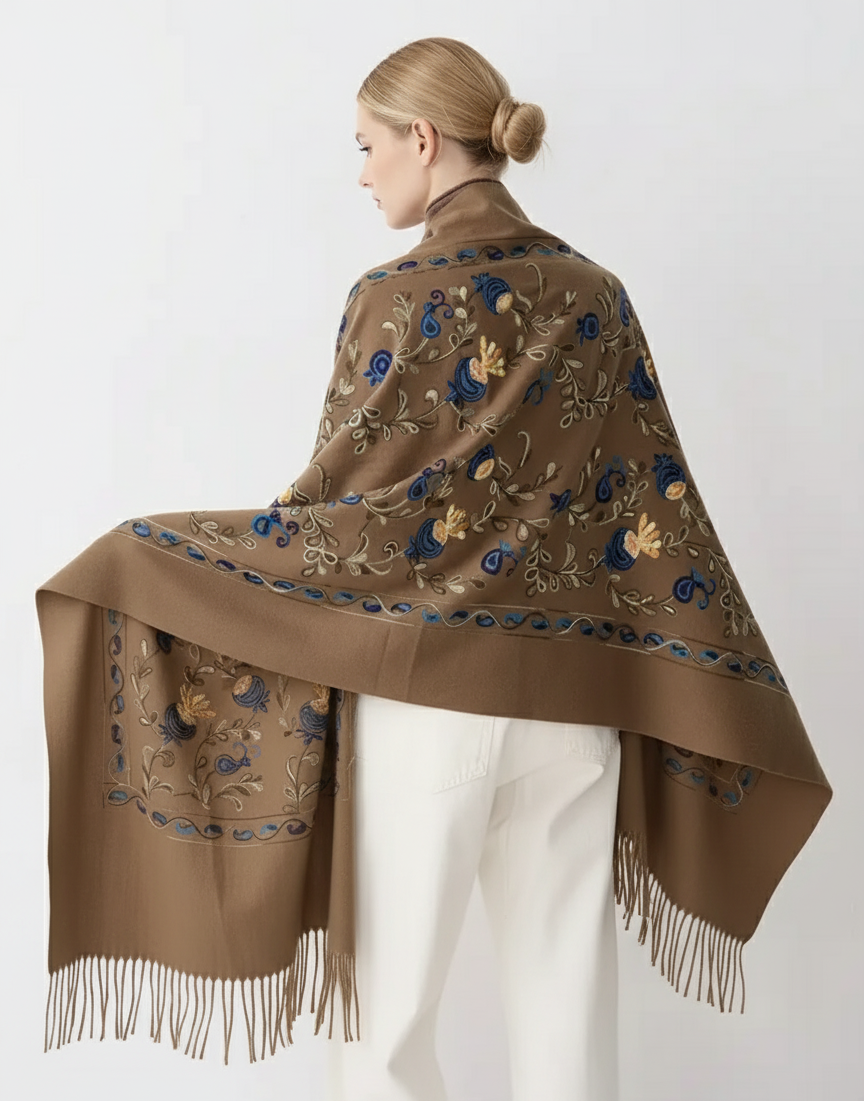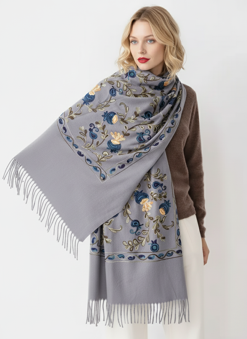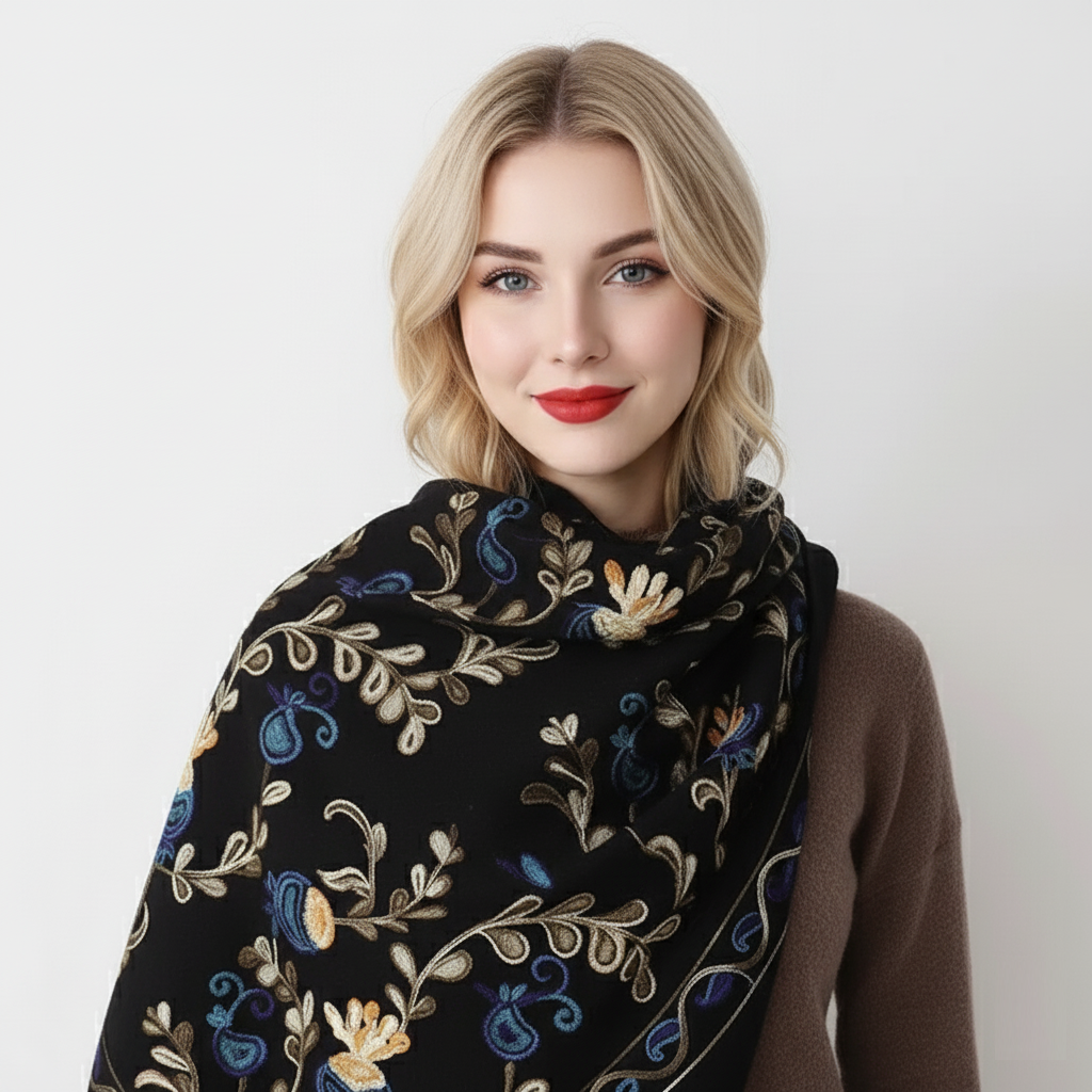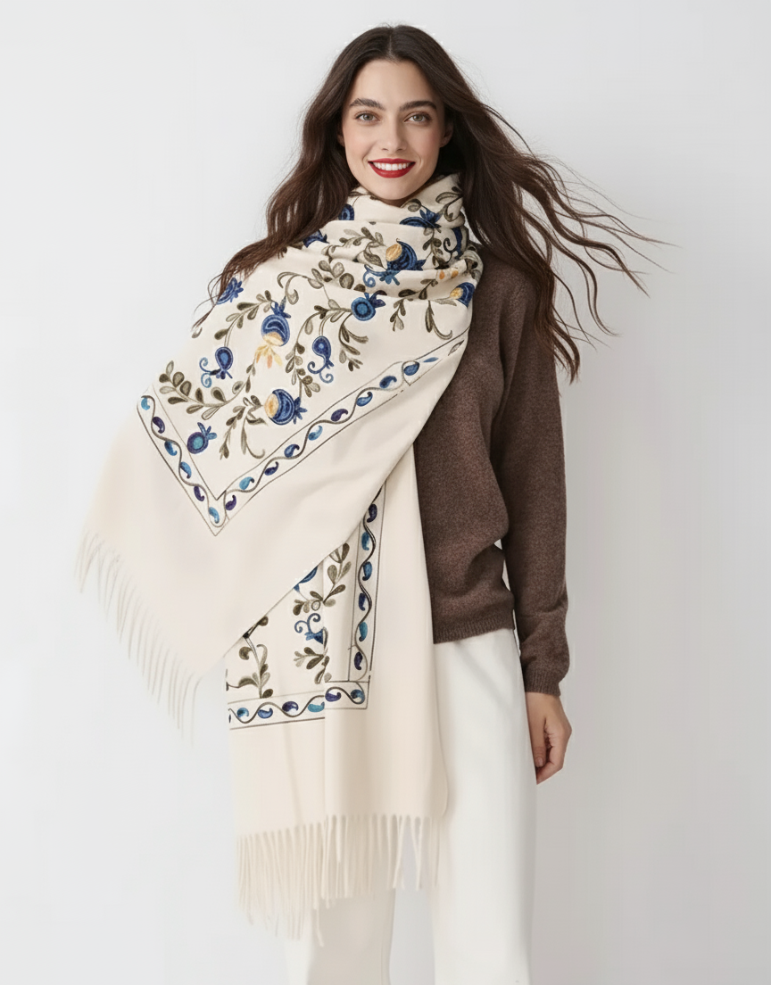 Krásny dlhý šál zdobený retiazkovou výšivkou ľudových ruží a strapcami.
