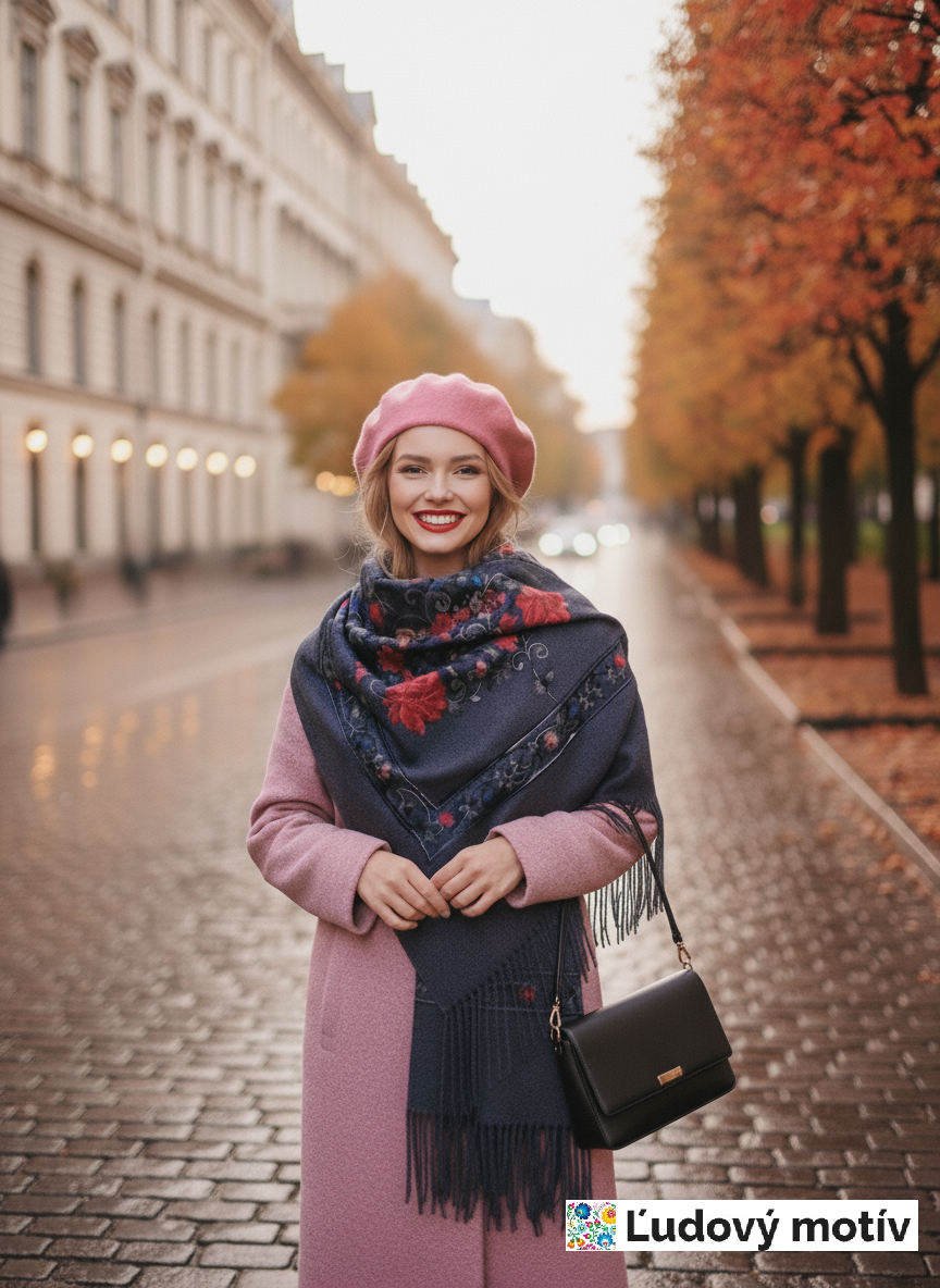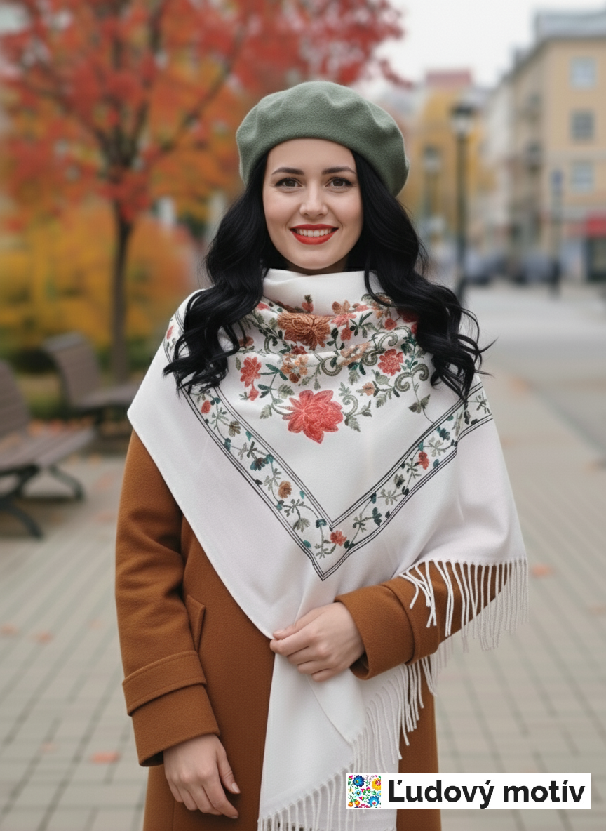 Krásny dlhý šál zdobený retiazkovou výšivkou ľudových ruží a strapcami.