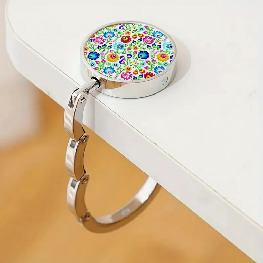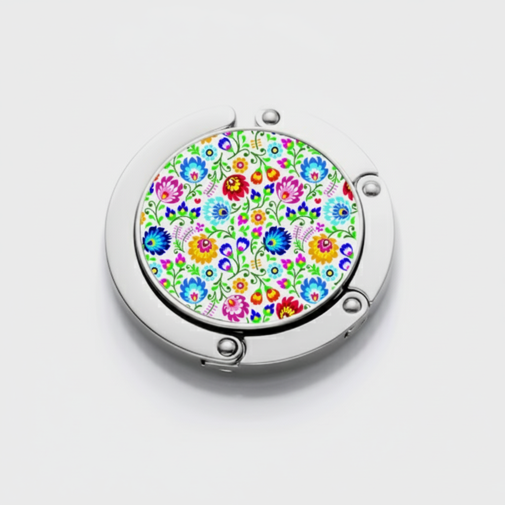 Kovový háčik na kabelku s ľudovým motívom zabezpečí dôstojné miesto vašej taške aj pri tom najmenšom stole.