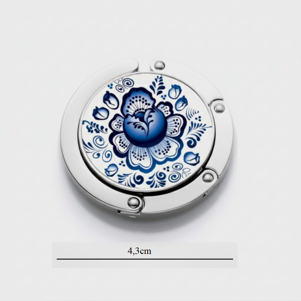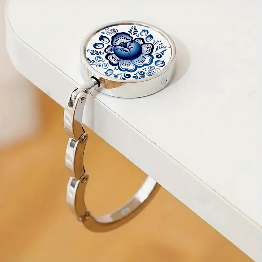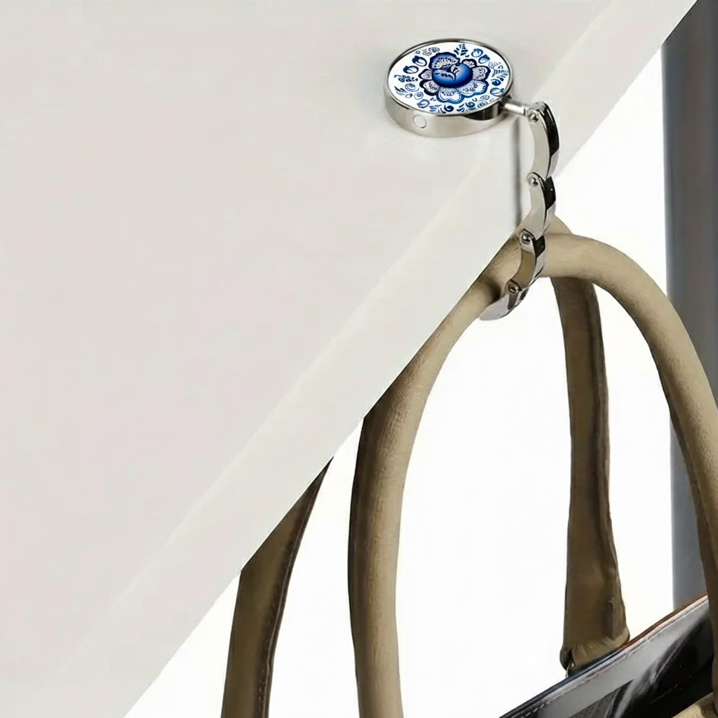 Kovový háčik na kabelku s ľudovým motívom zabezpečí dôstojné miesto vašej taške aj pri tom najmenšom stole.