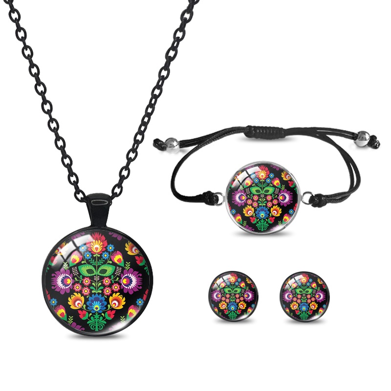 Sada retiazka s príveskom + náušnice + náramok - kytica na čiernom pozadí