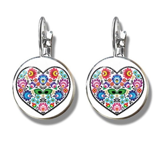 Visiace náušnice s ľudovým motívom - orámované srdiečko